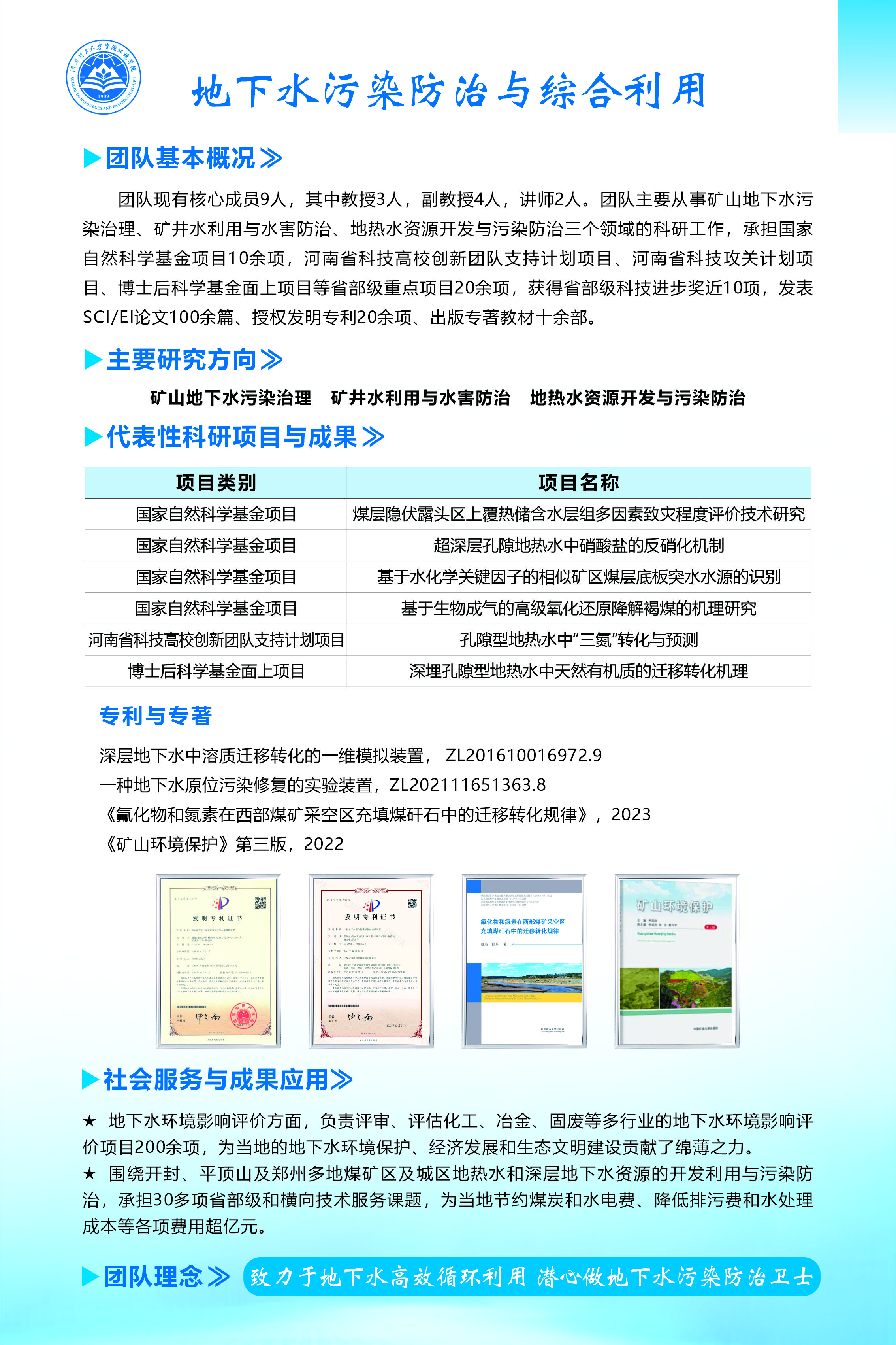 团队现有核心成员9人,其中教授3人,副教授4人,讲师2人。团队主要从事矿山地下水污染治理、矿井水利用与水害防治、地热水资源开发与污染防治三个领域的科研工作,承担国家自然科学基金项目10余项,河南省科技高校创新团队支持计划项目、河南省科技攻关计划项目、博士后科学基金面上项目等省部级重点项目20余项,获得省部级科技进步奖近10项,发表SCI/EI论文100余篇、授权发明专利20余项、出版专著教材十余部。