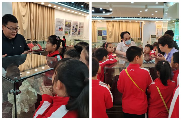 孩子们手持队旗来到地球科学馆,分两批次先后进入地球科学馆,郑德顺、孙凤余指导讲解。从地球演化、痕迹化石、矿物与矿产资源3个部分地球科学馆展区进行了讲解,孩子们热情高涨地探寻展柜中一个个形态各异的化石、矿石。讲解结束后,孩子们对各自心中好奇的化石,纷纷向提问求解,两位专家既专业又生动的解答让孩子们心中的问号彻底消解。