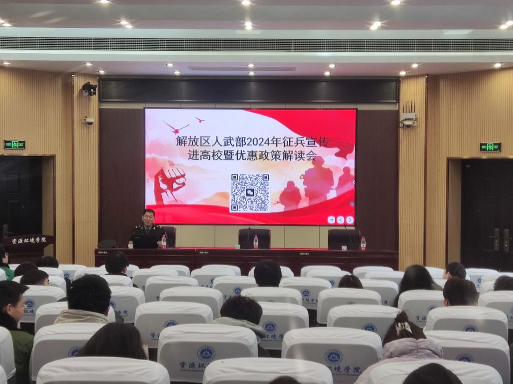 第Ⅰ学术报告厅开展征兵宣传进高校暨优惠政策解读会。校武装部、解放区人武部及毕业生等100余人参加解读会。