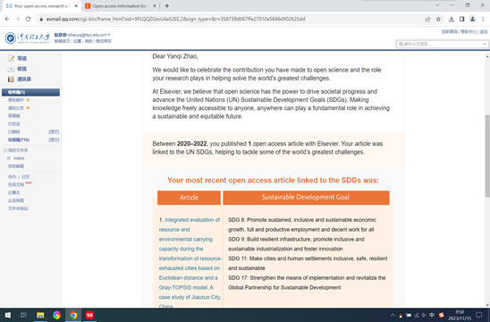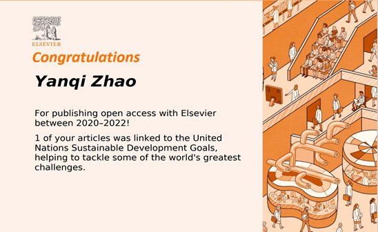 赵彦琦老师发表于国际著名期刊《生态指标》(《Ecological Indicators》)题为《基于欧氏距离和灰色Topsis模型的资源枯竭型城市转型过程的资源环境承载力综合评价——以焦作市为例》(《Integrated evaluation of resource and environmental carrying capacity during the transformation of resource-exhausted cities based on Euclidean distance and a Gray-TOPSIS model: A case study of Jiaozuo City, China》)的研究成果,对解决联合国可持续发展目标中一些大的挑战性问题具有突出贡献,获得爱思唯尔出版集团认可并颁发荣誉证书。论文从资源、环境和社会经济(RES)三个方面评价了资源枯竭城市(焦作市)的承载能力,并构建了障碍度诊断模型,计算和分析了影响焦作市可持续发展的主要控制因素。研究成果对联合国可持续发展目标(UN-SDGs)的8、9、11和17条具有突出贡献,对解决世界上可持续发展的一些挑战性问题大有帮助。