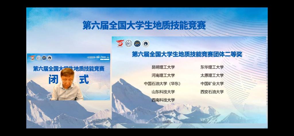 第六届全国大学生地质技能竞赛原定于2020年在成都举办,受疫情影响三次延迟,最终在2022年5月举行,组委会和承办方首创常态化疫情防控模式下的新模式,首次采用“线上+线下”比赛的方式举行,大赛主会场设在成都理工大学,分会场设置在各参赛单位。此次比赛共有来自浙江大学、中山大学、中南大学、中国地质大学、中国石油大学、中国矿业大学、西北大学等61所高校的159支代表队、477位学生在地质技能综合应用、野外地质技能竞赛(虚拟仿真)、地质标本鉴定、地学知识竞赛4个单元展开对决。我校参赛队员积极准备、团结协作,取得了优异成绩。